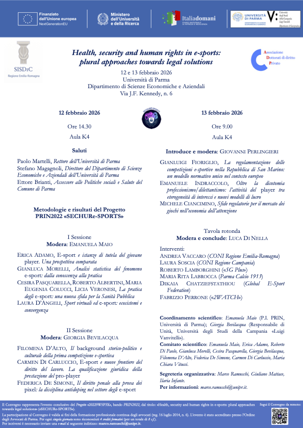 Giovedì 12 e Venerdì 13 febbraio 2026 si terrà il convegno finale del progetto PRIN 2022 PNRR SECHURESPORTS – Health, SECurity and HUman Rights in E-sports: plural approaches towrds legal solutions di cui l’Università di Parma è partner capofila con un’unità di ricerca coordinata dalla professoressa Emanuela Maio.